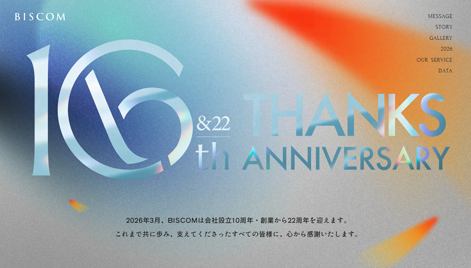 BISCOMは 2004年の創業から22年、法人設立から数えて10周年を迎えます。これまで多くのご縁とご支援に恵まれ、共に歩み、支えてくださったすべての皆様に、心から感謝いたします。