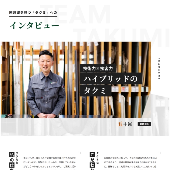 特にタクミトーヨー住器様は働いているみなさんが常に改善を意識し、人柄の良さがにじみ出る雰囲気の良い会社様という印象から「働く人」が見えることが信頼と安心につながる裏付けであると考え、スタッフインタビューやスタッフ紹介など「タクミな人々」を紹介するコンテンツを追加しました。