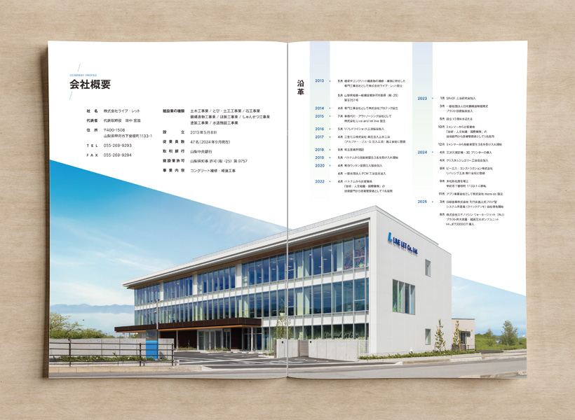 ホームページとあわせ、会社案内のパンフレットをおつくりいたしました。商談時に使用した際、最善のツールとなるようにあえてWebサイトのデザインは流用せず、ページ構成も商談時の流れとリンクさせて組み立てています。表紙デザインも2パターンを制作し臨機応変に使い分けることができます。