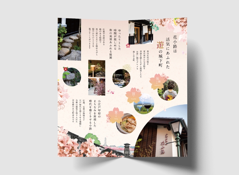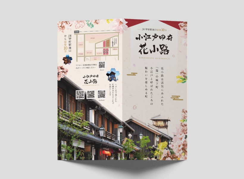 花小路では、公式サイトとあわせて来場者集客(一般のお客様に向けたプロモーション)を目的とした二つ折りリーフレットの制作も担当いたしました。Webサイトと同じトーン・世界観で統一することにより、どちらから接触しても施設のイメージや位置づけがぶれないよう配慮しました。