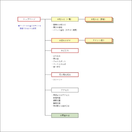 甲州夢小路と同様に「お店をさがす」導線を中心とした構成とすることで、来場者が直感的に使えるサイトを目指しています。