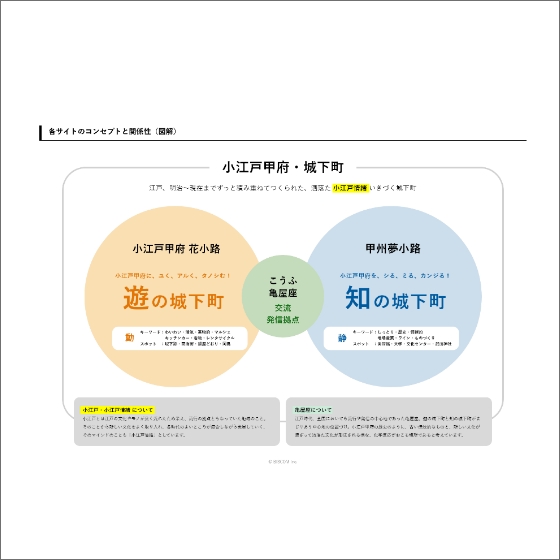 花小路は、近接する「甲州夢小路」と対になる存在として計画されています。そこで本サイトでは、甲州夢小路が持つ文脈を踏まえつつ、花小路を「遊の城下町」として位置づける構成としました。