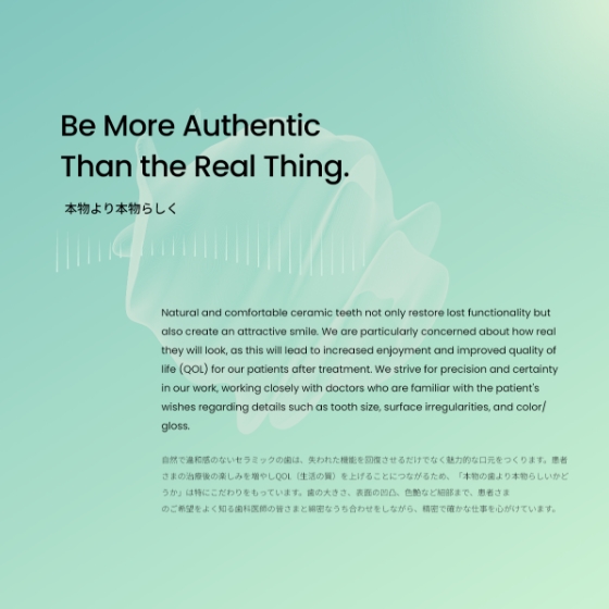歯科技工という専門領域をグローバルにも通用する新しい世界感で見せる一方、実際の現場や手仕事のリアリティは写真によって丁寧に伝え、対立することなく同じトーンの中で自然につながって見えるよう構築しています。
