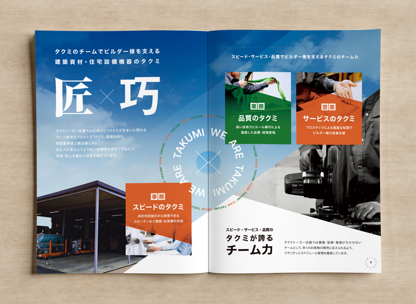 ホームページとテイストを揃えた「会社案内」「採用案内」のパンフレットをそれぞれおつくりいたしました。パンフレット自体のデザインは2種類を統一しながらもロゴカラーの配色を入れ替え、会社案内にはイメージカット・採用向けには人が入った写真を使用して「別のもの」と分かるよう工夫を施しています。