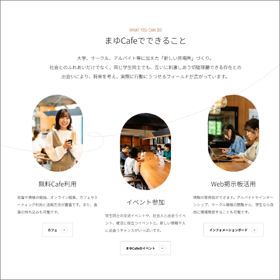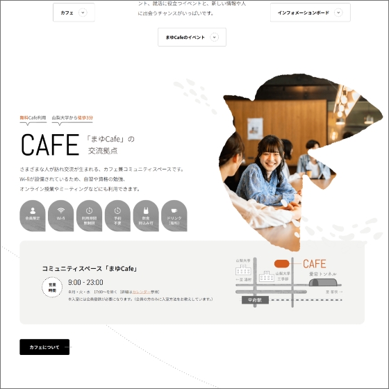 そのためサイト全体では写真を多く使用し、学生が生き生きと「まゆCafe」を活用している様子を中心に構成。