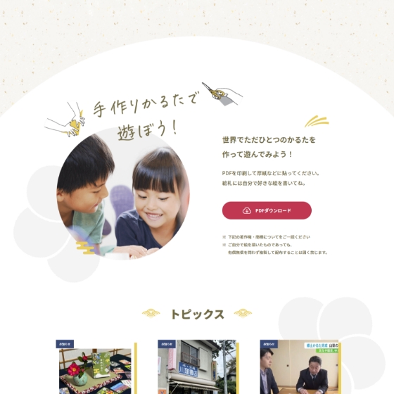 個人で製作された「やってみるじゃん 甲州かるた」の公式サイト制作を担当いたしました。本サイトでは、かるたという和のモチーフをベースにしながら、落ち着きすぎないポップな印象を取り入れ、子どもにも興味を持ってもらえる世界観づくりを意識しています。