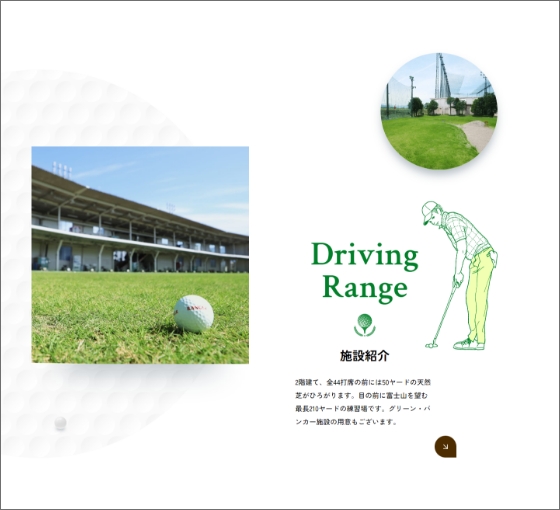 ファーストビューでは、施設の特徴である開放感のある風景写真をメインに使用。富士山が望めるロケーションを視覚的に伝えることで、単なる練習場ではなく「気持ちよく打てる場所」であることを印象づけています。