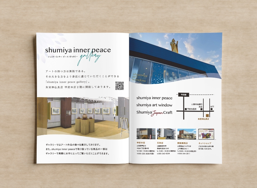 朱宮神仏具店様で新たに展開されたECサイト「shumiya inner peace」のコンセプトブックをおつくりいたしました。A6サイズ・8ページのコンパクトな中綴じ冊子で、商品発送の際の同梱・店舗での配布を想定しています。