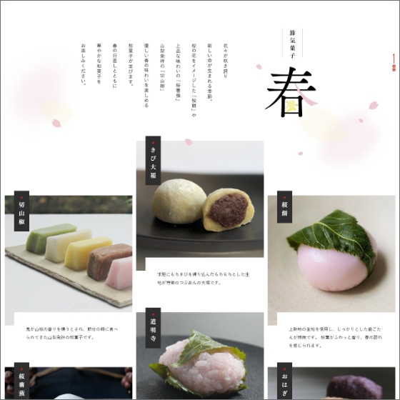 和菓子の魅力である季節性を反映するため、春夏秋冬の季節商品を紹介するページと年中和菓子のページをそれぞれを設けています。